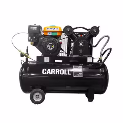 Compresor de aire tipo pistón, CABEZAL: 3HP con 2 cilindros en «V» (CAR-TB-30), MOTOR A GASOLINA: TONKA DE 5.5 HP, PRESIÓN: 115PSI, VOLUMEN: 11.7 CFM, TANQUE HORIZONTAL: 108 Litros, COLOR: Negro CARROLL